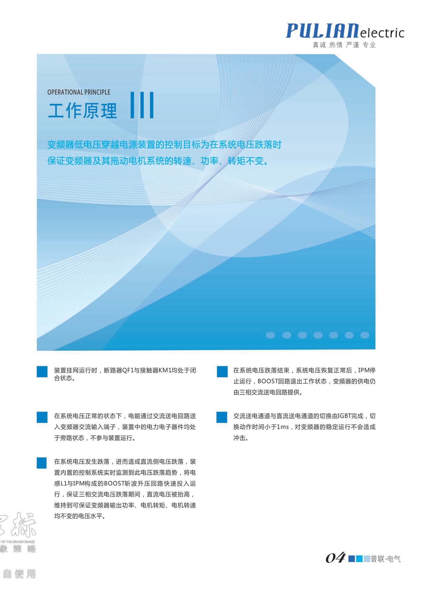 ● 在系统电压跌落结束,系统电压恢复正常后,IPM停止运行,BOOST回路退出工作状态,变频器的供电仍由三相交流送电回路提供。